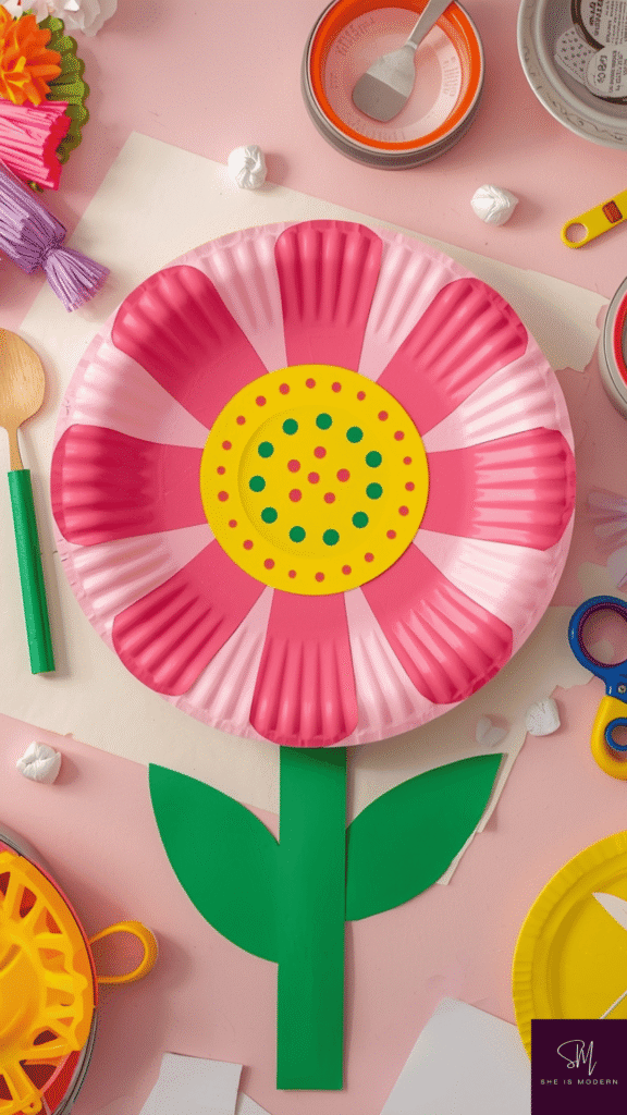 This flower craft is colorful, creative, and perfect for spring themes, and if your kids enjoy seasonal DIY activities, they’ll also love these easy spring craft ideas for kids. Start by painting the paper plate in bright shades like pink, yellow, or purple. Once dry, cut around the edges to create petal shapes. Kids can choose rounded, pointy, or wavy petals depending on their style. This helps them explore shapes and improve cutting skills in a fun way.