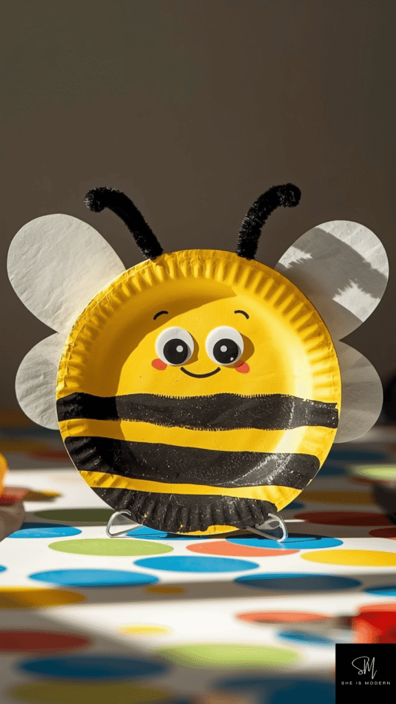 This bee craft is playful and perfect for learning about insects. Start by painting the paper plate yellow and let it dry completely. Then add black stripes using paint or paper strips. Kids can decide how thick or thin the stripes should be. This allows them to explore patterns while also improving their focus and creativity.