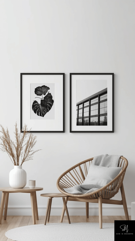 Keep the arrangement neat and balanced. A small gallery wall or a single large frame can create a strong visual impact without making the space feel busy. Thin frames in black, white, or wood tones help maintain the minimalist look.