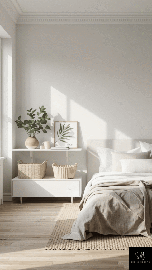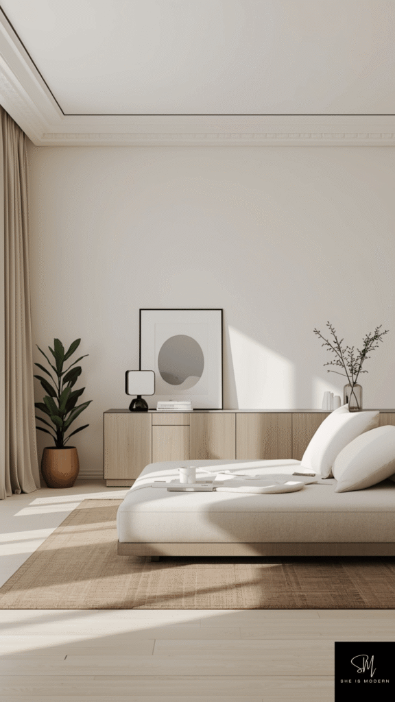 Wall art adds personality while keeping the design simple. It allows you to express your style without overwhelming the space. This idea helps complete the room while keeping it calm and visually pleasing.