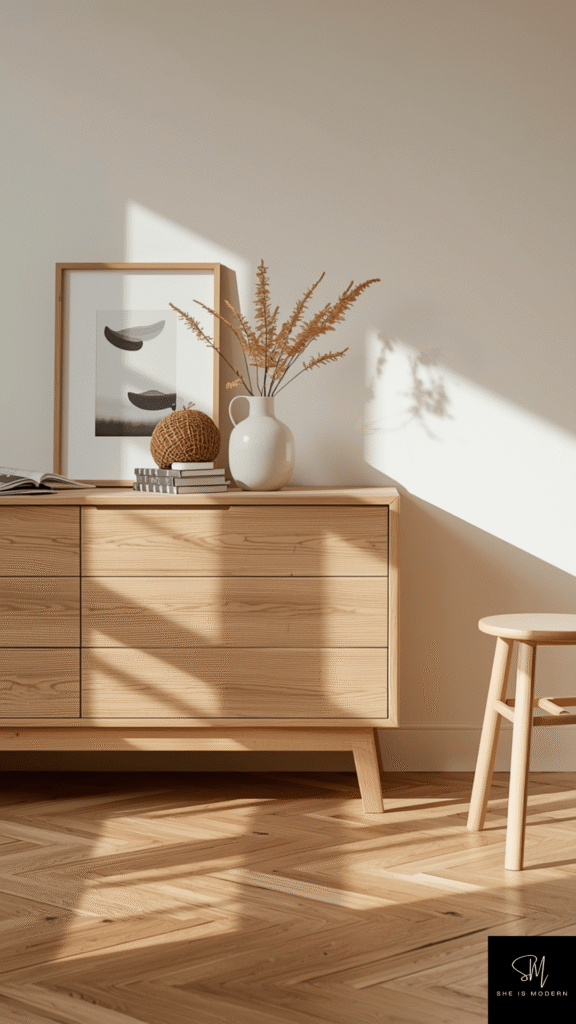 Mixing wood with other natural materials like linen or wool enhances the overall feel. Avoid overly dark or glossy finishes, as they can make the space feel heavy. Light wood keeps the room bright and relaxed, which is the main goal of Scandinavian design.