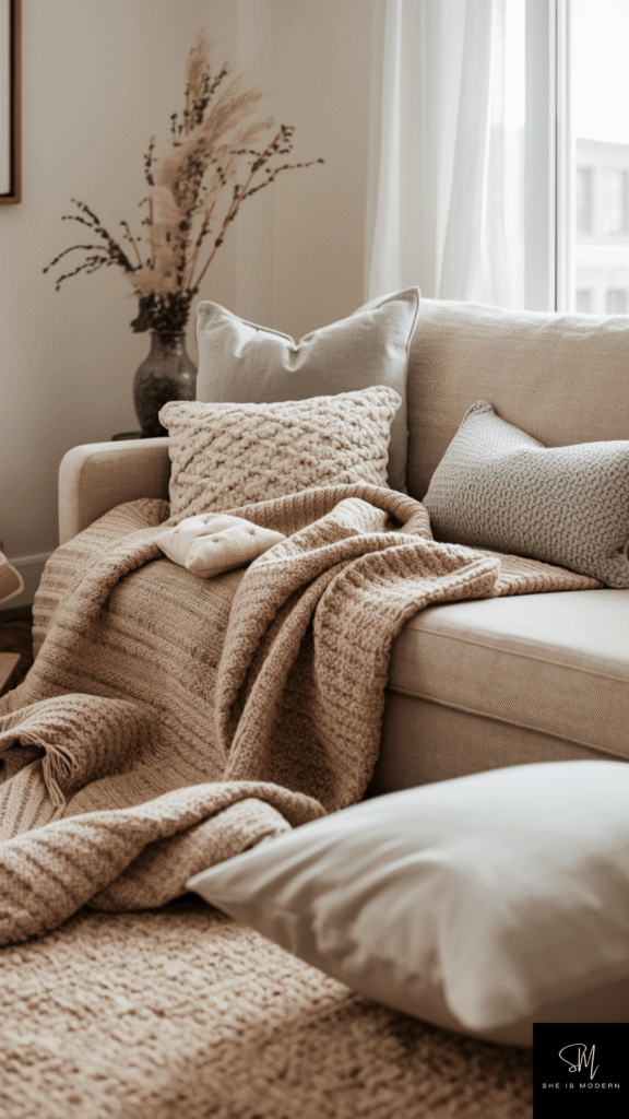Soft neutral textures help add depth to a Scandinavian space without using bold colors. Materials like linen, wool, cotton, and light knits create a calm and cozy feel. Even with a simple color palette, different textures make the room feel warm and lived in instead of flat or plain.