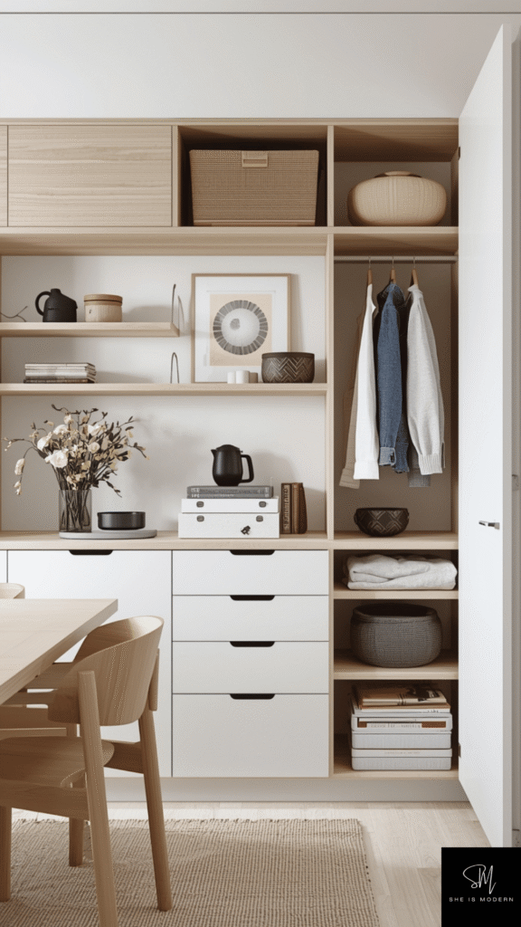 Scandinavian design focuses on keeping spaces clean and organized, and smart storage plays a big role in this. Instead of adding bulky cabinets, use simple and functional storage that blends into the room. Open shelves, built in cabinets, and hidden storage help keep things neat without making the space feel heavy or crowded.