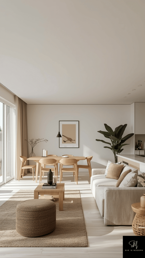 You can layer textures through rugs, curtains, cushions, and throws. A soft wool rug with a linen sofa and cotton cushions creates a balanced and comfortable setup. Keeping everything in soft tones like beige, cream, or light gray helps maintain the clean look while still adding interest.