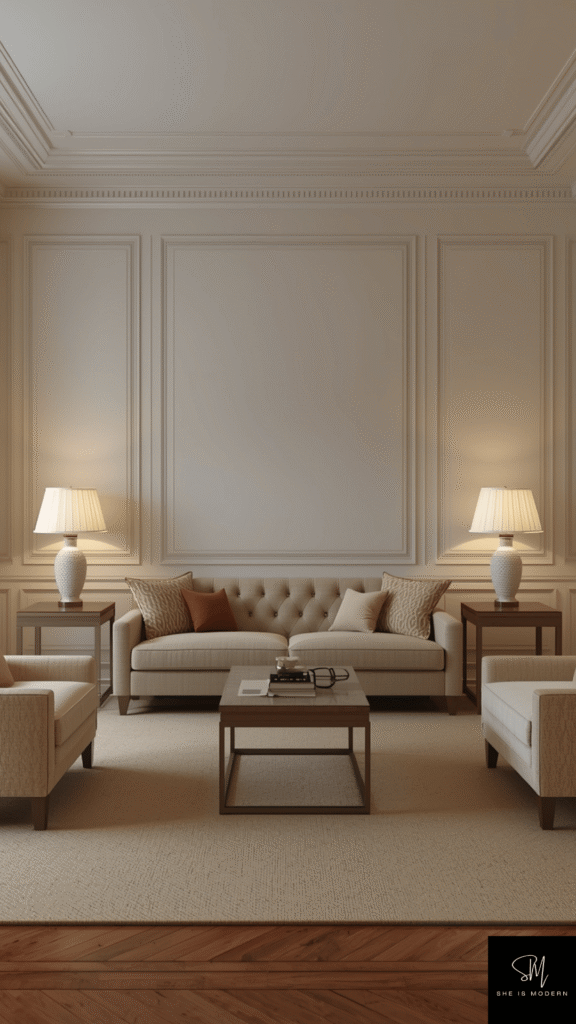 Symmetry helps create a sense of order and calm in transitional design. Arranging furniture in a balanced way makes the room feel organized and easy to understand. For example, placing two chairs on both sides of a sofa creates a clean and structured look. This simple arrangement makes the space feel more put together.