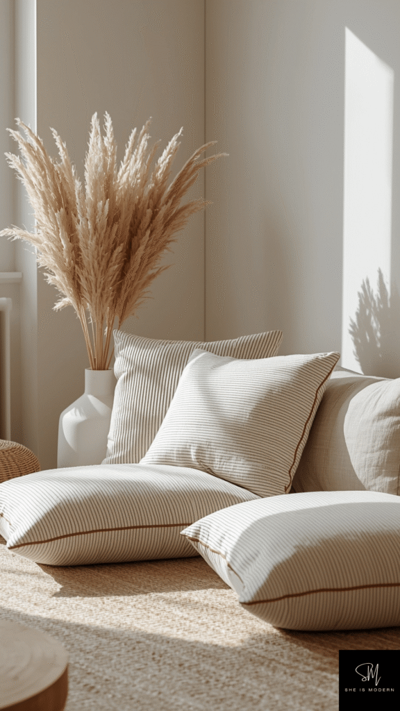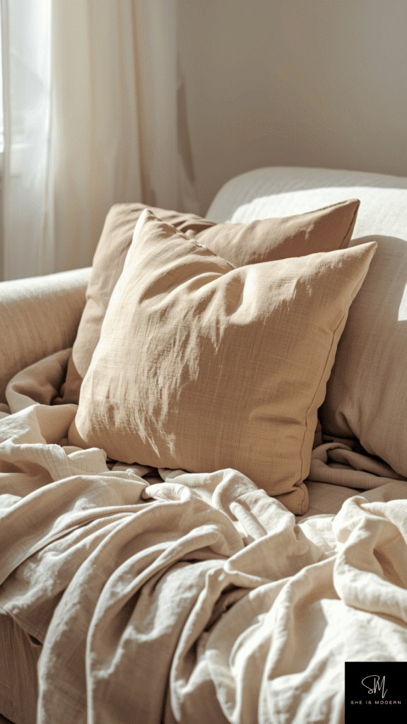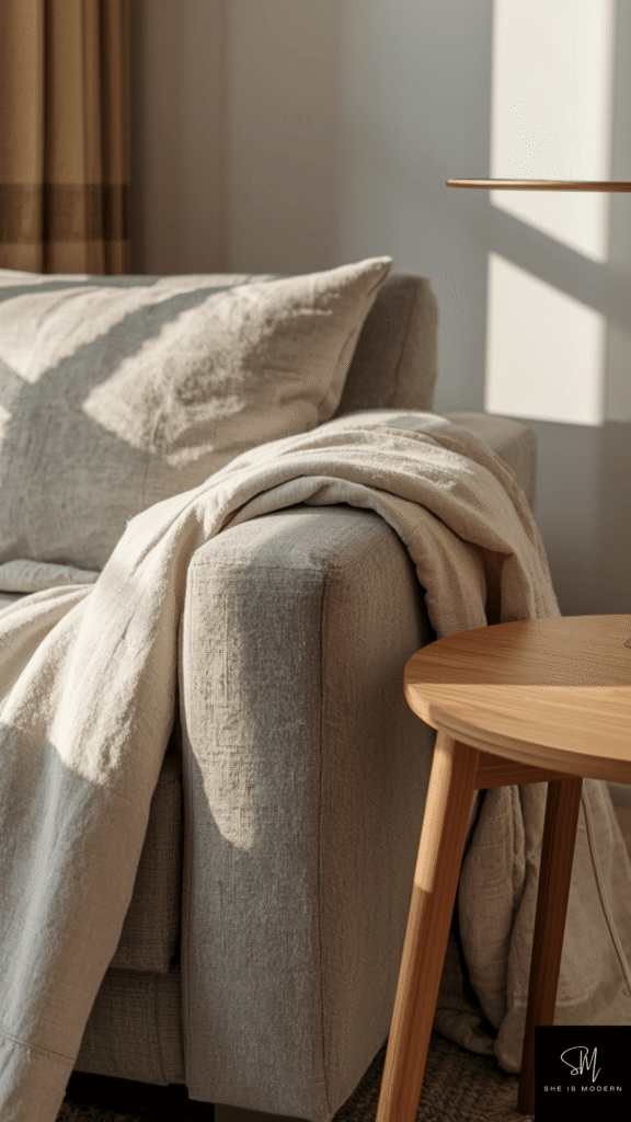 Use these fabrics in sofas, cushions, curtains, and rugs. Layering fabrics adds depth and comfort. For example, a linen sofa with soft cotton cushions looks balanced and fresh. Keep colors neutral or soft to match the overall design. This helps maintain a calm and clean look. Patterns should be simple and not too bold. Subtle designs work best.