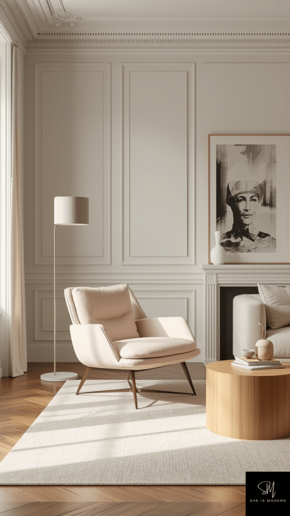 Textures also play a big role here. Combine smooth surfaces like glass or metal with warm wood or soft fabrics. This adds depth and comfort. A modern lamp next to a classic side table works well. Small details make a big difference. Keep the layout open and uncluttered. This helps every piece stand out. The result is a space that feels stylish, cozy, and balanced. It’s a simple way to create a home that feels both current and timeless at the same time.