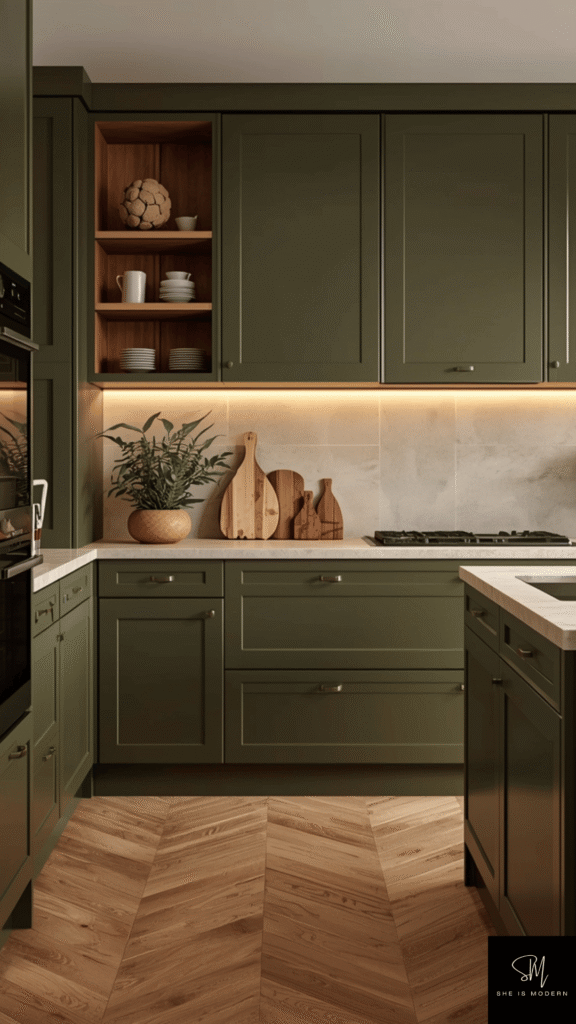 You can pair olive green with warm wood tones or beige surfaces. This creates a soft and earthy balance. Add brass or gold handles for a slightly elegant touch. Good lighting helps keep the space from feeling too dark. Natural light works best with this shade.