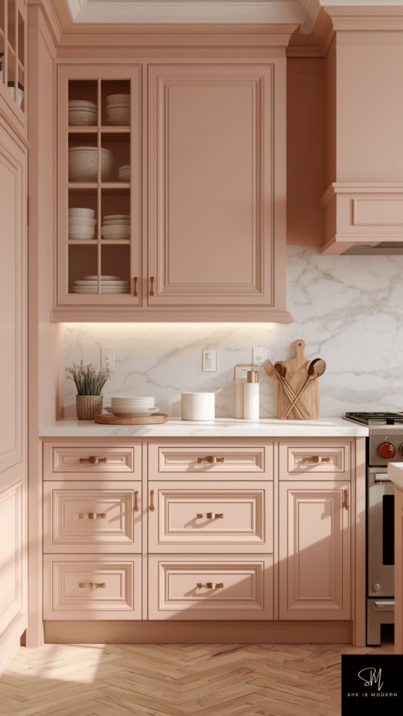 This idea is perfect for a stylish and modern space. It feels fresh and different from usual kitchen colors. Blush pink adds personality while still keeping the look soft and elegant.