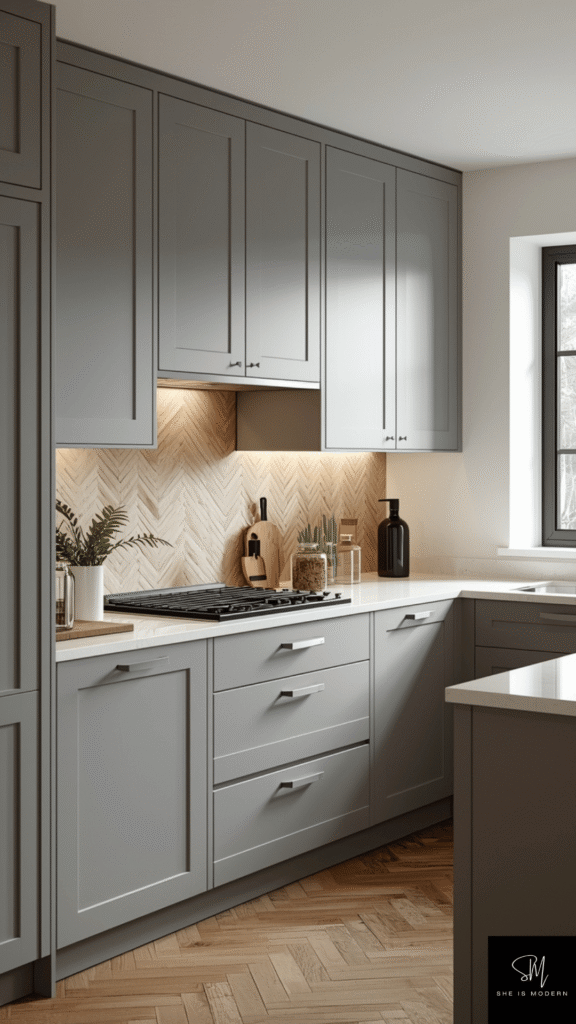 You can pair gray with white countertops or wooden textures. This creates a cozy and stylish mix. Add warm lighting to keep the space from feeling cold. Small touches like metal handles or glass cabinets can make the design more interesting. Gray also works well with stainless steel appliances.