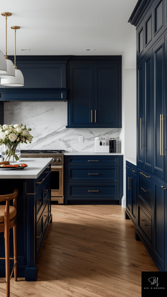 This idea is great if you want a statement kitchen. It feels modern, classy, and unique. Navy blue brings depth and character without being too bright. It’s perfect for people who love bold but elegant spaces.