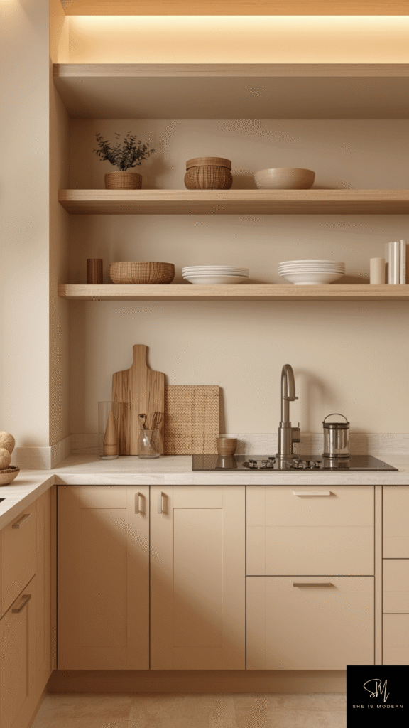 You can pair beige with wood, white, or soft gold accents. These combinations create a natural and calm look. Add soft lighting to enhance the warmth. Open shelves with simple decor can make the kitchen feel even more inviting. Beige works well with both modern and traditional designs.