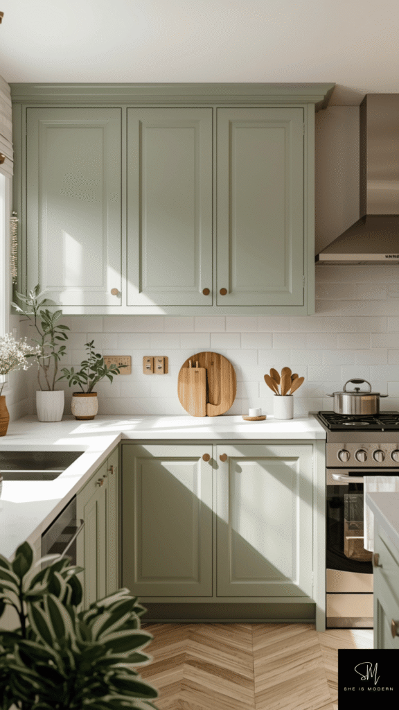 You can pair sage green with white countertops or wooden textures. This creates a clean and earthy look. Add plants to enhance the natural feel. Soft gold or black handles can give a modern touch. This color also works well with light flooring and simple decor.