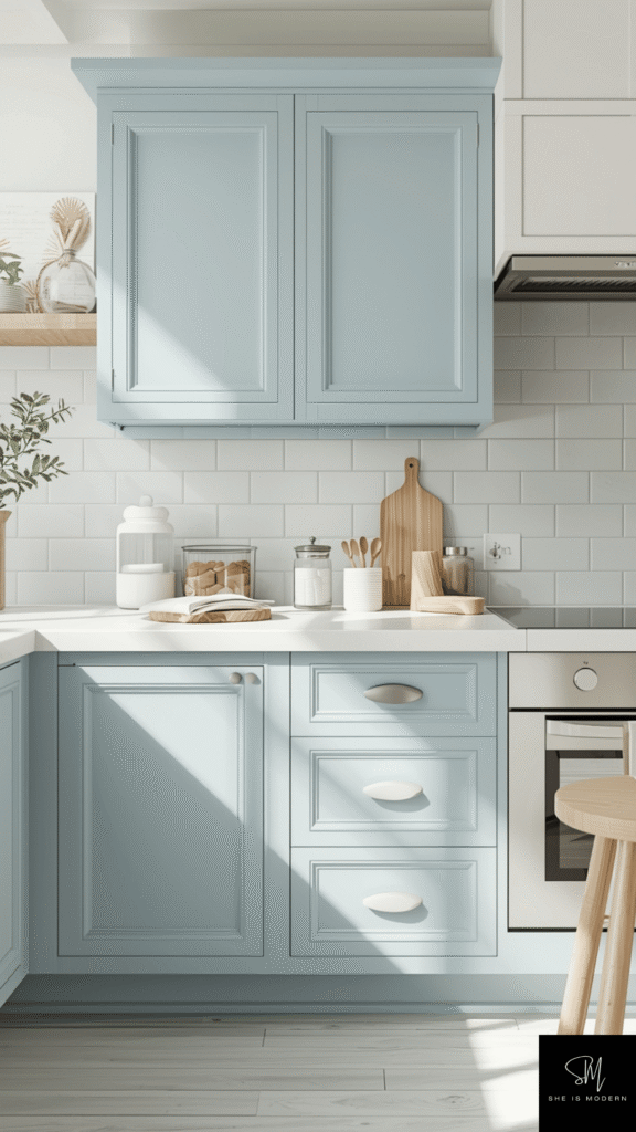 This idea is perfect for a light and cheerful kitchen. It feels fresh without being too bold. Pastel blue brings a soft touch of color that is easy to live with every day.