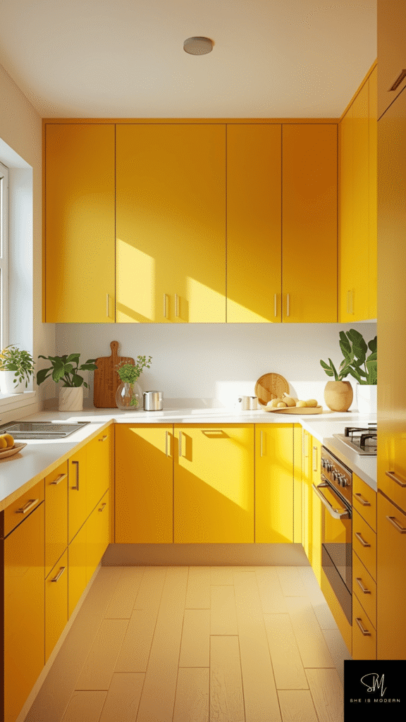 This idea is perfect if you want a cheerful kitchen. It lifts the mood and makes the space feel welcoming. Yellow is fun, fresh, and full of positive energy.