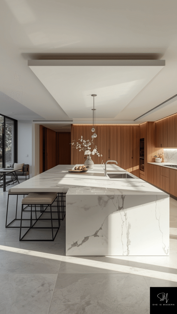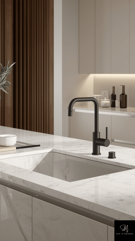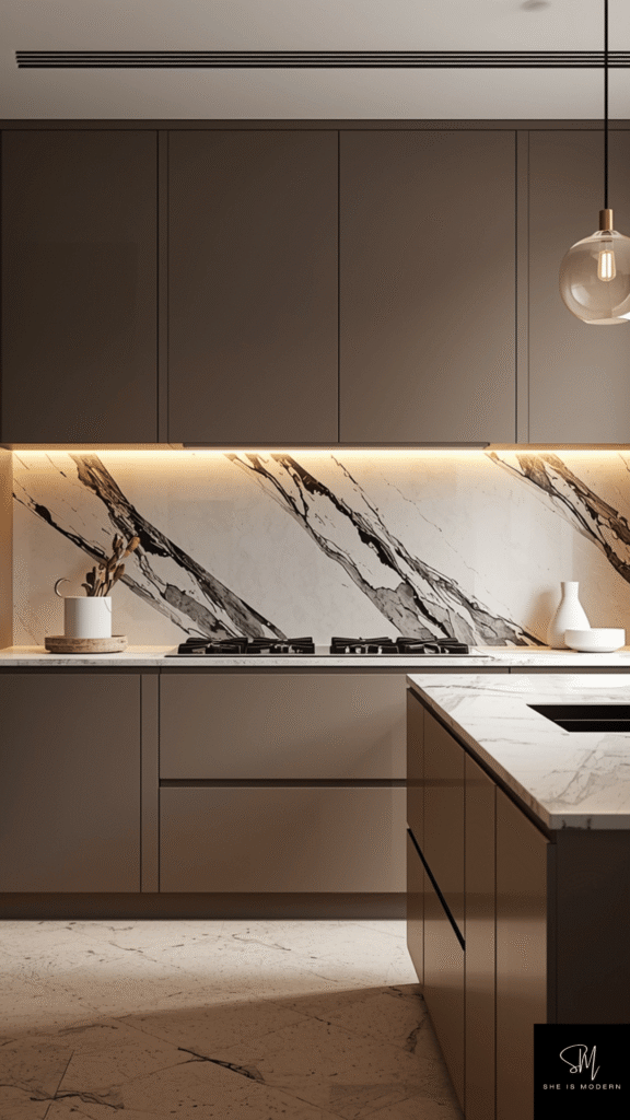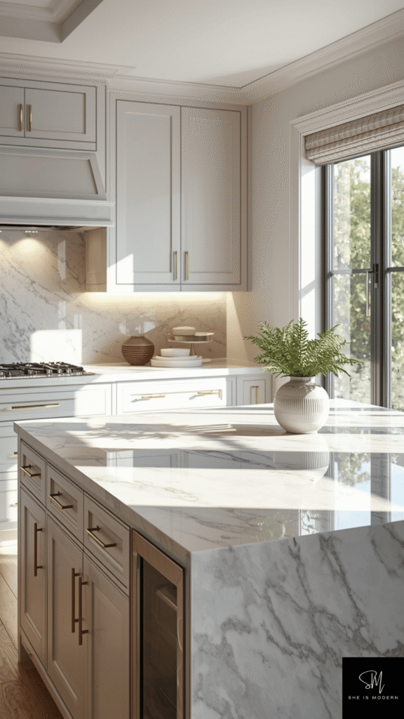 To keep the look balanced, pair marble with simple cabinets and minimal decor. Avoid overcrowding the countertop so the material stands out. Soft lighting helps highlight the texture and gives a warm, inviting feel. This creates a space that feels both modern and classic.