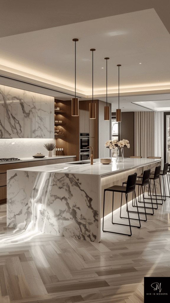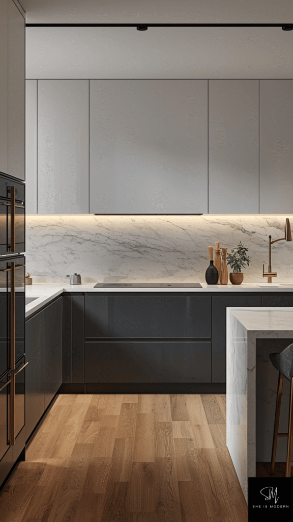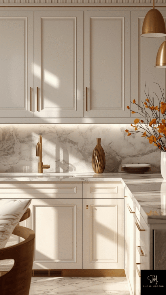 Gold and brass accents instantly add a luxury feel to any kitchen. Small details like cabinet handles, faucets, light fixtures, and even decor pieces can completely change the mood of the space. These warm metallic tones bring richness and elegance without overwhelming the design.