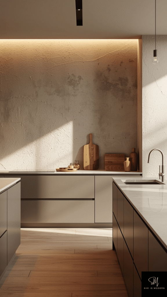 These textures work well behind cooking areas or open shelving. They catch light differently throughout the day, adding subtle movement and interest. Neutral tones like warm white, beige, or soft gray keep the look elegant and calm.