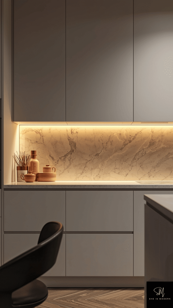 Use under cabinet lighting to highlight backsplash textures or marble surfaces. It adds depth and makes your kitchen feel more finished. This upgrade is simple but gives a big impact in everyday use.