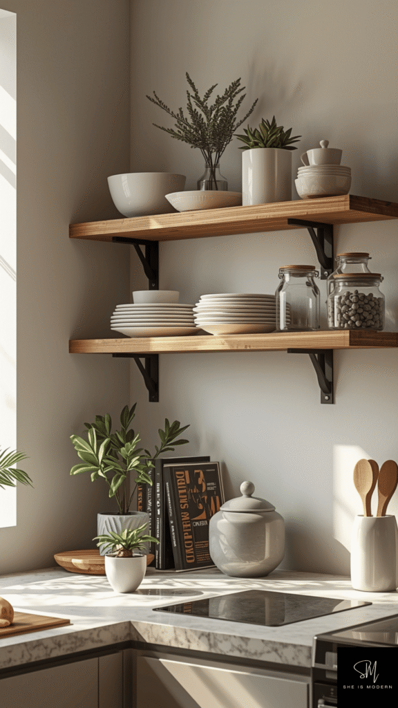 Wood shelves add warmth, while metal brackets give a modern touch. This idea works best when styled carefully. Open shelving can make your kitchen feel more personal and thoughtfully designed.
