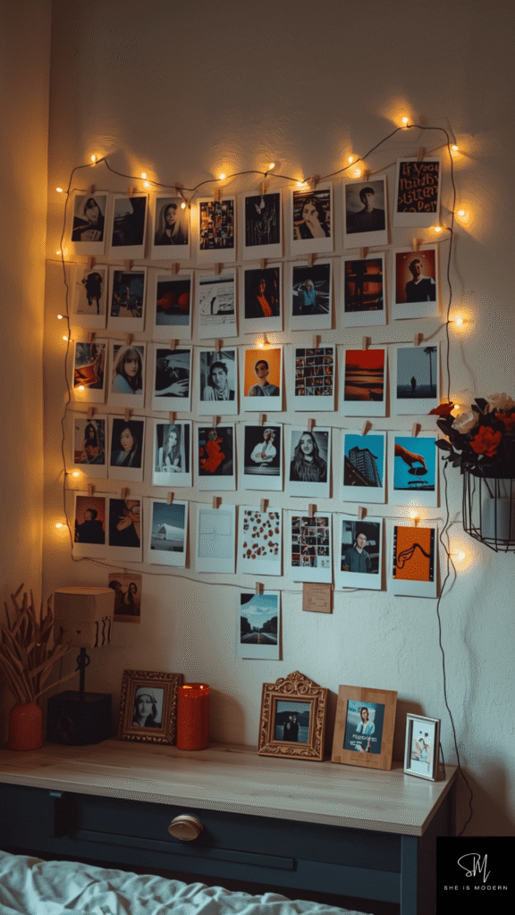 You can use clips, string lights, or tape to display the photos. String lights add a warm glow and make the wall look cozy. You can also use colored paper or frames for extra detail. This helps your photo wall stand out and feel more designed.