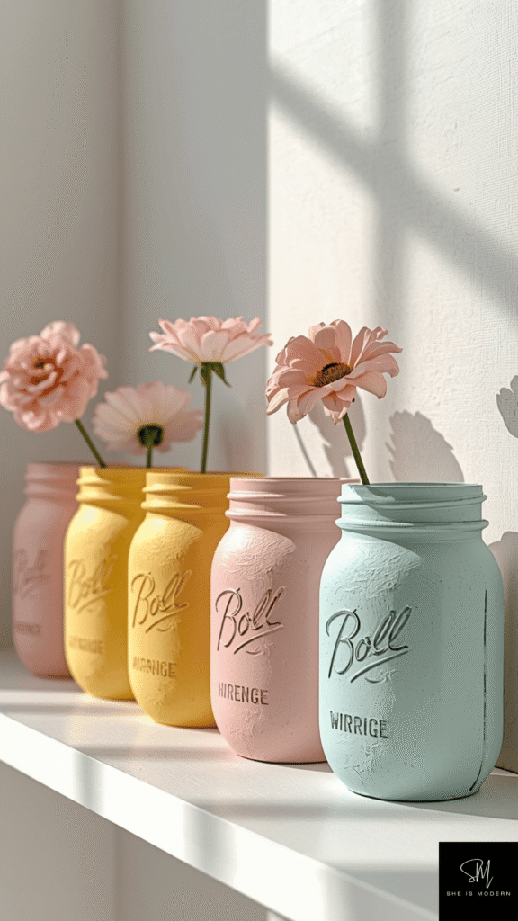 Painted mason jars are simple and useful decor pieces. You can use old jars and paint them in colors that match your room. Matte, pastel, or bold shades all work well. You can also add patterns like stripes or dots for a creative look. This is an easy project that does not need many supplies.