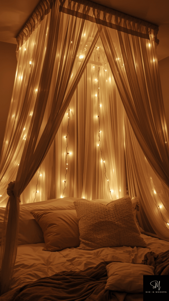 This idea is perfect for creating a cozy space. It works well in both small and large rooms. A bed canopy adds elegance without needing much effort.