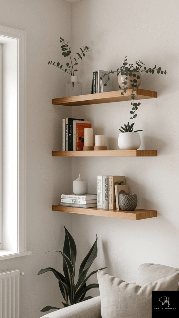 This idea is perfect for small rooms. It saves floor space and adds style to empty walls. Floating shelves are practical, easy to install, and very useful for everyday use.