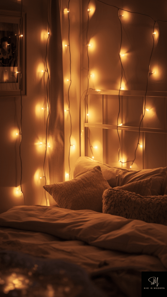 This idea is perfect for creating a calm and cozy space. It works well for both day and night. Fairy lights are simple, affordable, and make a big impact in any room.