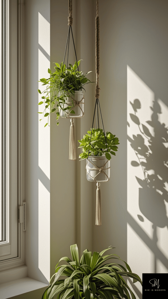 This idea is perfect for creating a calm and relaxing space. It connects your room with nature. Hanging planters are simple, stylish, and great for small or large rooms.