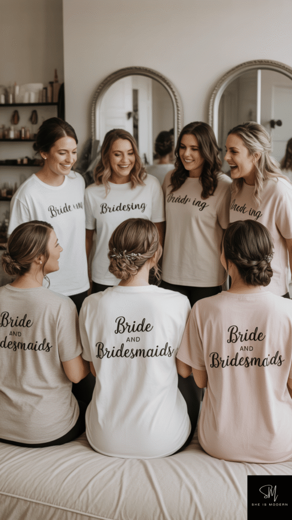 You can make each shirt unique by adding names, roles, or even the wedding date. This adds a thoughtful touch and makes each person feel special. Keeping the design simple helps it look clean and more aesthetic in photos. You can also add small icons like hearts, rings, or floral elements to match your theme without making the shirt look too busy or overwhelming.