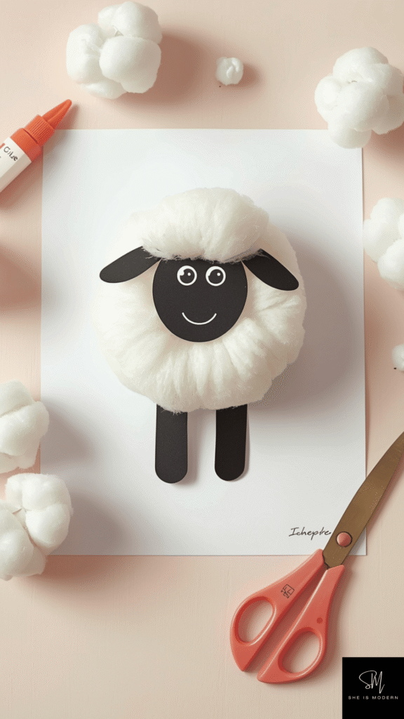Cotton ball sheep are soft, simple, and perfect for younger kids. Start by drawing or printing a sheep outline on paper or cardboard. Then let kids glue cotton balls all over the body to make it fluffy. Add a face using black paper or markers, and don’t forget small ears and legs. The texture of the cotton makes the sheep look cute and realistic.