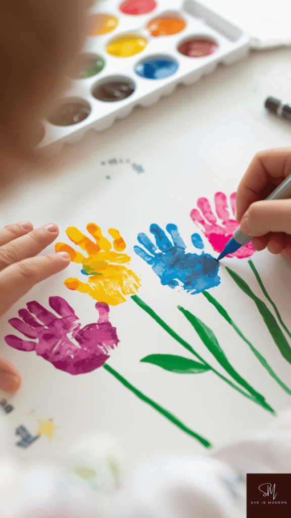 Fingerprint flowers are colorful, fun, and a little messy in the best way. Pour small amounts of paint onto a plate and let kids dip their fingers into it. Press their fingerprints onto paper in a circle to form flower petals. Then use a marker or brush to draw stems and leaves. Each flower turns out unique and full of personality.