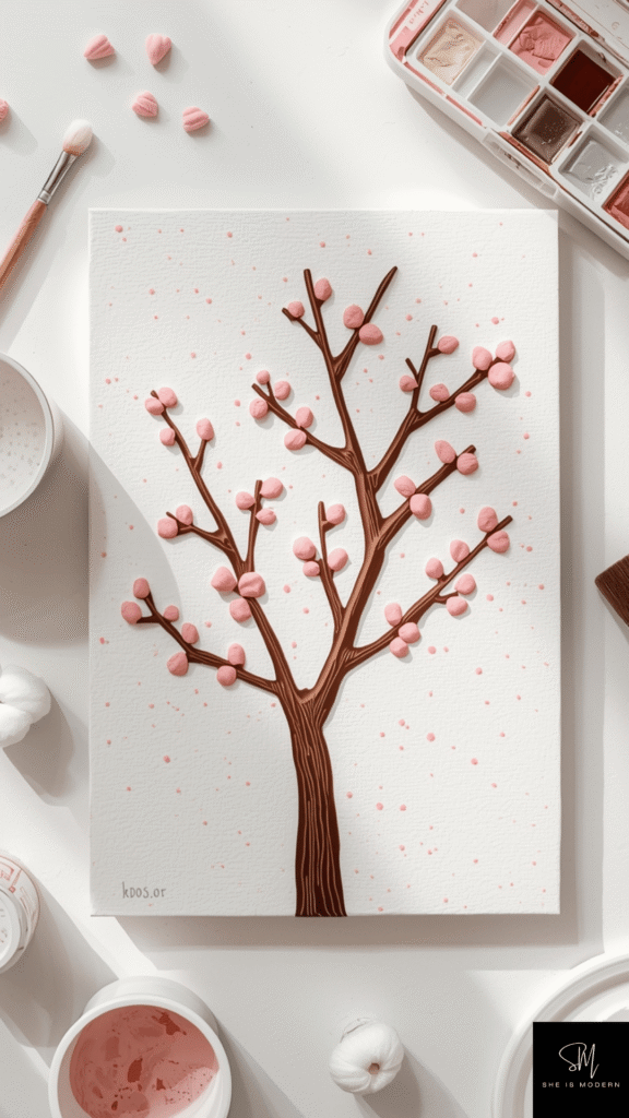 Spring tree art is a calm and creative painting activity. Start by drawing a simple tree with branches on paper. Then dip cotton swabs into pink, white, or light purple paint and gently dab them onto the branches. This creates a blossom effect that looks like real spring flowers.
