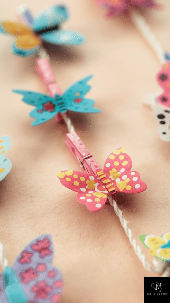 Once finished, clip the butterflies onto notebooks, curtains, or strings to display them. They can also be used to hold notes or drawings. It’s a small craft, but very useful and decorative. Kids love seeing their butterflies “sit” around the house, adding a playful spring touch.