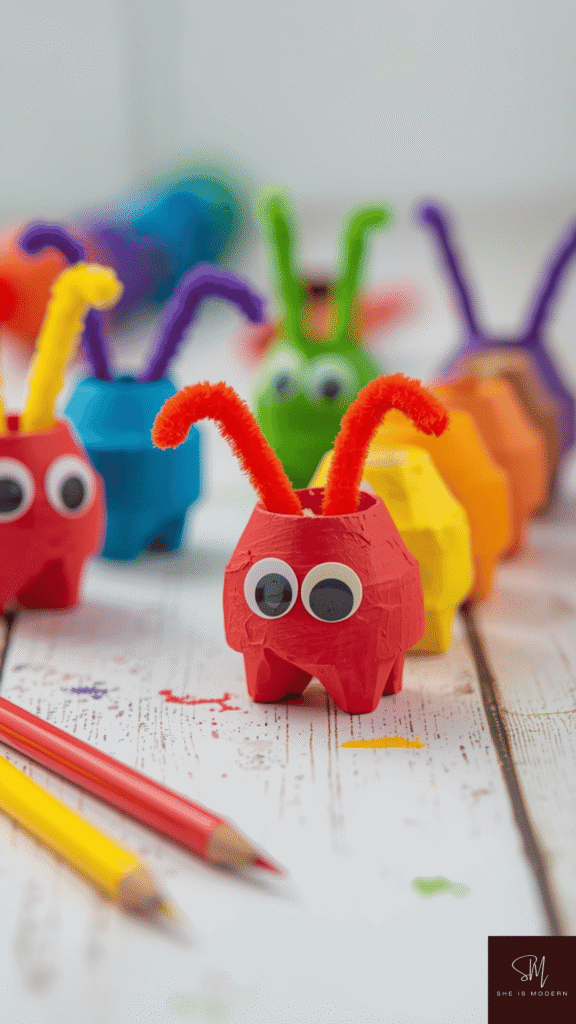 Egg carton caterpillars are a fun recycled craft that kids love. Cut an egg carton into strips, then let kids paint each section in bright colors. Once dry, add googly eyes and pipe cleaner antennae. This turns a simple carton into a cute caterpillar.