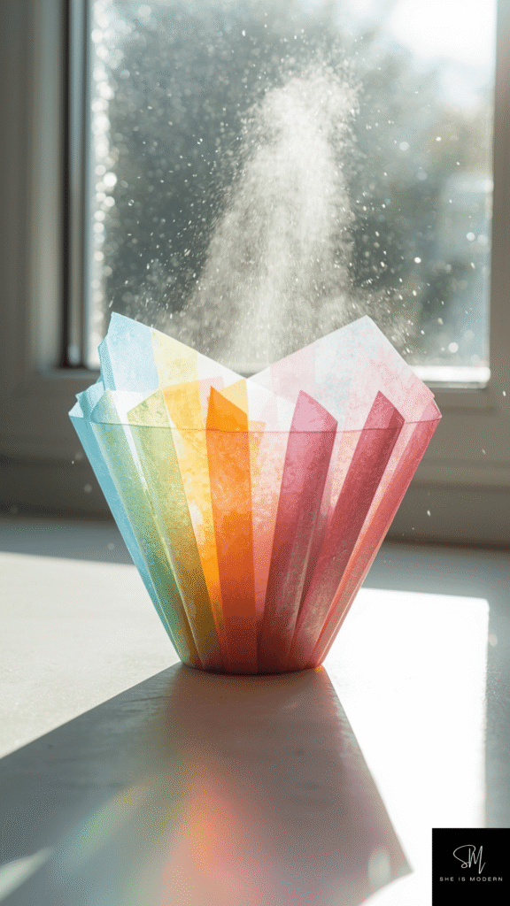 This craft is exciting because it combines art with light. Kids can explore how colors look different when sunlight hits them. It’s also very easy to customize with different shapes and patterns. Younger kids can focus on sticking pieces randomly, while older kids can create designs like rainbows or flowers.