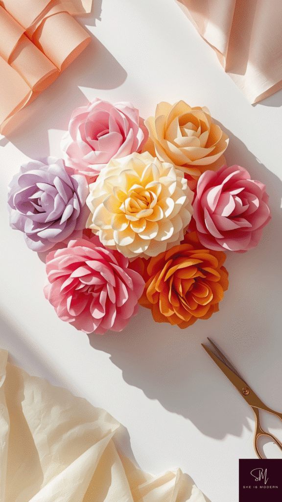 These flowers are perfect for decorating rooms, parties, or classrooms. You can hang them from the ceiling, tape them on walls, or even create a full flower garland. They stay fresh forever and bring a soft spring feel to any space. Kids feel proud seeing their handmade flowers brighten up the room, making this craft both fun and meaningful.