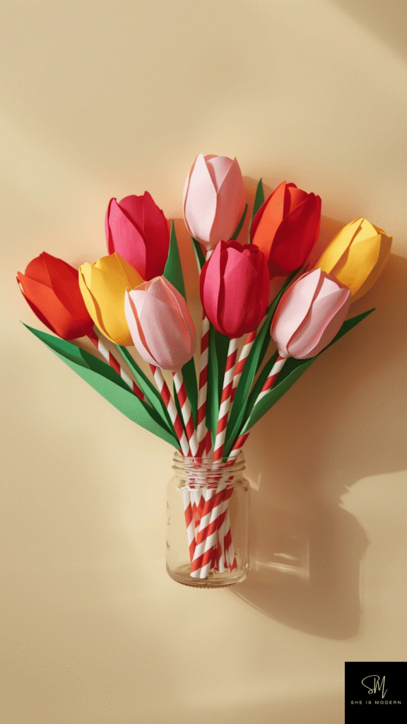Paper straw tulips are bright, cheerful, and very easy for kids to make. Cut tulip shapes from colored paper like red, pink, or yellow. Then attach each flower to a paper straw using glue or tape. You can add green paper leaves to make the tulip look more real. Kids can quickly create multiple flowers and build their own bouquet.